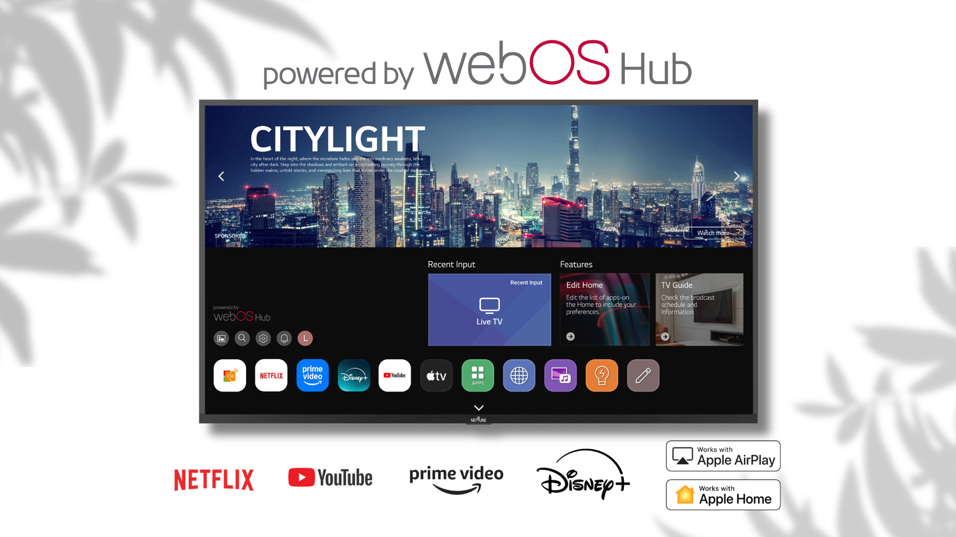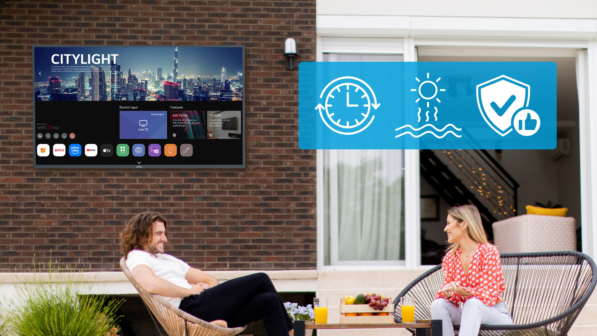 The Neptune Full Sun Outdoor Smart TV is built with webOS Hub, giving you access to all your favorite apps and streaming services! With hundreds of options available in the webOS content store, you can customize your outdoor entertainment lineup and enjoy movies, shows, and more right from your backyard.