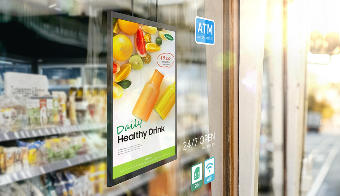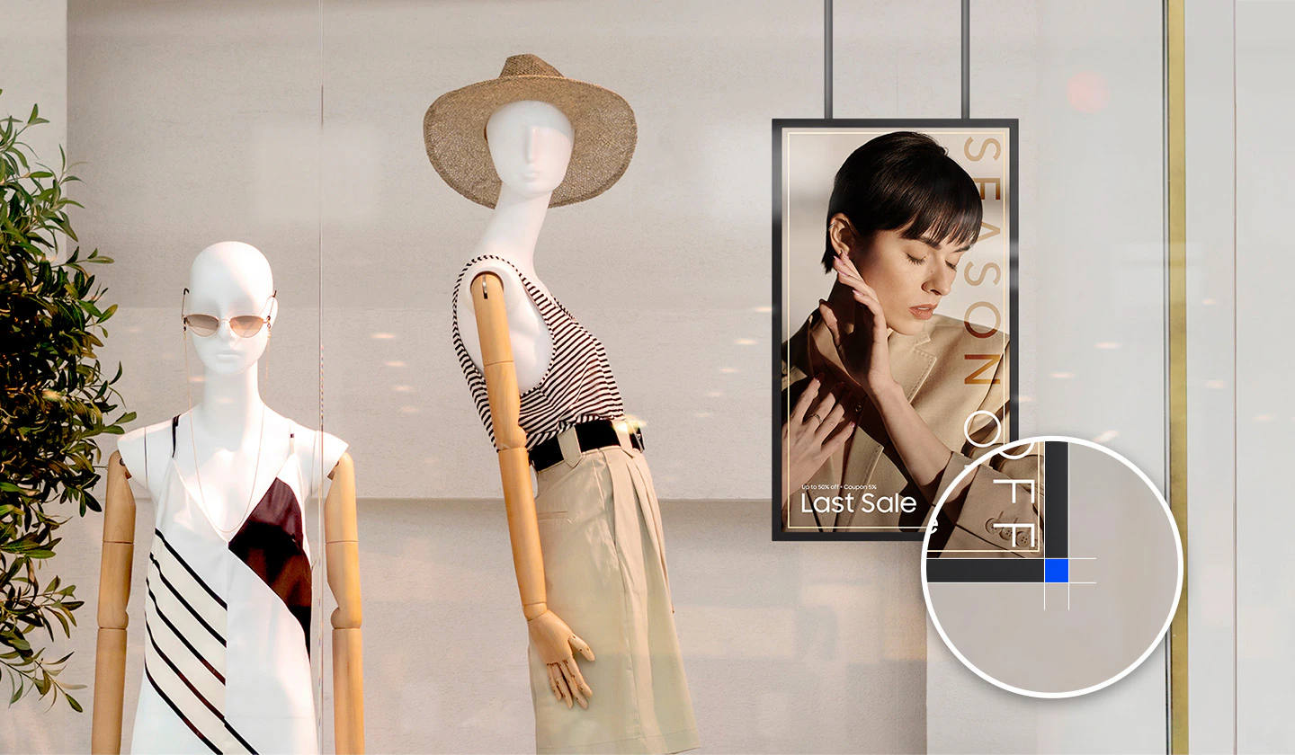 Samsung Window Signage enhances your storefront to attract customers. Featuring high brightness and clarity, even in direct sunlight, the display ensures your messages stand out. The slim design enables maximum space utilization while creating captivating and engaging customer experiences.